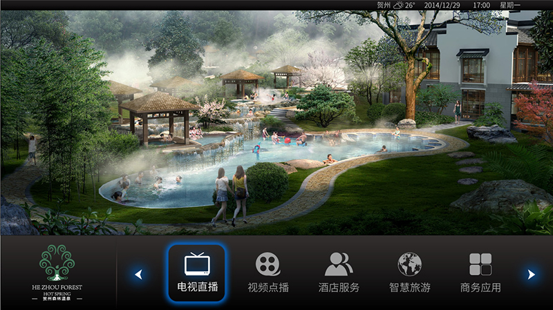 新聞來源:宏輝智通 發(fā)布日期:2015-11-29 瀏覽次數(shù):10154"輝視"智能酒店互動視訊系統(tǒng)是為寬帶網(wǎng)上承載廣泛的VOD點播系統(tǒng)而提供的整套方案,采用“業(yè)務(wù)與承載分離、管理與服務(wù)分離”及“集中式管理、分布式服務(wù)” 架構(gòu)思想、分層建議、分級管理,整個系統(tǒng)按功能主要分為五個層次:接入層、網(wǎng)絡(luò)承載層、媒體層、控制層、業(yè)務(wù)層,讓我們成為時代的酒店智能客房。廣西賀州溫泉酒店安裝“輝視”IPTV視訊系統(tǒng)